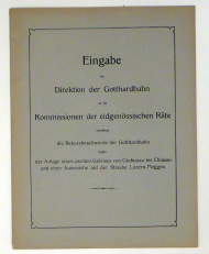 betreffend die Rekursbeschwerde der Gotthardbahn wegen der Anlage eines zweiten Geleises von Giubiasco bis Chiasso und einer Ausweiche auf der Strecke Luzern-Meggen. Luzern: Gotthardbahn[gesellschaft], 1907. 8 S., Einband: Bedruckter grauer Or.Umschlag. Format: 4°. Für die Direktion der Gotthardbahn gezeichnet von Schrafl; Luzern, im Januar 1907