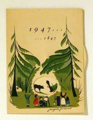 Centenaire du premier chemin de fer suisse de Zurich à Baden. Dessin de Jacques Ferrand. Paris: Rivade, [1947]. Doppelkarte, gefaltet, mit farbiger Illustration. Einband: ohne Einband. Format: 10,5 x 14 cm. Karte gefaltet. Auf dem hinteren Teil runde Scheibe montiert, die gedreht werden kann, so dass sich die darauf gedruckten Wagen und Figuren bewegen. Ein in den vorderen Teil gestanztes Loch gibt den Blick auf die Wagen frei