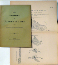 Zch.: Schulthess, 1896. 87, (1) S., mit zehn meist mehrfach gefalteten Beilagen. Einband: Or.br. in Klappenmappe in Leinen mit Druckknopf. Format: 4°. Erstausgabe. Konzessionsgesuch zu Handen des Bundesrates mit den folgenden Beilagen: 1. Situationsplan der ganzen Anlage, 2. Geologisches Längenprofil, 3. Querprofile, 4. Temperaturtabelle, 5. Ausblick auf das Trace gegen NW., 6. Ausblick auf das Trace (Eiger und Mönch) gegen SO., 7. Ausblick auf das Trace vom Jungfraugipfel, 8. Ausblick von der Station Jungfraujoch, 9. Rundsicht vom Gipfel der Jungfrau, Panorama von Ing.Top. X(aver) Imfeld., 10. Situationsplan der 1. Sektion in verjüngtem Massstab. Beigelegt ist zudem ein (gedruckter) Begleitbrief von Guyer-Zeller vom September 1896 an Empfänger, von denen er annimmt, dass sie dem "Unternehmen Ihre Sympathien entgegenbringen." In diesem Projektbeschrieb geht Guyer-Zeller noch von einem Bau bis auf den Gipfel aus
