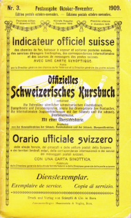 Enthaltend die Fahrpläne sämtlicher schweizerischen Eisenbahnen, Dampfboote und Personenposten, sowie der Grenzgebiete des Auslandes, die internationalen Zugsverbindungen mit der Schweiz und die Schweiz. Postbotenkurse. Mit einer Übersichtskarte. Bern: Stämpfli, 1909. ca. 500 S., mit zahlreichen Anzeigen. Einband: Gelber Or.br. Format: 8°. Dreisprachiger Text (Deutsch, Französisch, Italienisch)