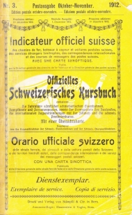 Enthaltend die Fahrpläne sämtlicher schweizerischen Eisenbahnen, Dampfboote und Personenposten, sowie der Grenzgebiete des Auslandes, die internationalen Zugsverbindungen mit der Schweiz und die Schweiz. Postbotenkurse. Mit einer Übersichtskarte. Bern: Stämpfli, 1912. ca. 500 S., mit zahlreichen Anzeigen. Einband: Gelber Or.br. Format: 8°. Dreisprachiger Text (Deutsch, Französisch, Italienisch)