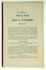 Basel: Schwezerische Centralbahn-Gesellschaft, 1865. 14 S., Einband: Original broschiert. Format: gr. 8°. Bericht des Verwaltungsrates and die Aktionäre betreffend der Beteiligung der Centralbahn and der Gotthardbahn sowie Beschluss-Antrag, der es der Gesellschaft ermöglichen sollte, sich an der Gotthardbahn zu beteiligen. Beilage I: Antrag der Kommission der Gotthard-Vereinigung an den Verwaltunsrat der Centralbahn über die Beteilgung and der Gotthardbahn. Beilage II: Vertrag zwischen der Nordostbahn und der Centralbahn über die gemeinschaftliche Beteiligung der beiden Gesellschaften an der Gotthardbahn