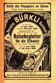 Reisebegleiter für die Schweiz. Nach den offiziellen Bekanntmachungen. Zch.: Fretz, 1922. 480 S., mit Anzeigen. Karte auf ausklappbaren Vorsätzen. Einband: Gelbe Or.Br. Format: kl.8°. Gratisbeilage zum Kursbuch Bürkli: "Personen-Fahrpreise ab schweizerischen Hauptstationen nach inländischen Stationen". Zweisprachiger Text (deutsch, französisch)