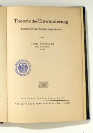 dargestellt am Beispiel Argentiniens. Mit einer fünffarbigen Karte. Berlin: Mittler & Sohn, 1931. 153 S., Einband: Bibliothekseinband in Halbleinwand. Format: 3°. Anschliessend an einen längeren Aufenthalt in Argentinien entwickelte "Attraktivitätstheorie" für die Einwanderung. Mit zahlreichen Tabellen und Skizzen zur Wirtschaft in Argentinien und der Einwanderung. Stand ehemals in der Hauptbücherei der Marinestation der Nordsee der Reichsmarine