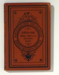 I. Teil: Technik, Funktionen und Zustände im Münz-, Mass- und Gewichtswesen; II. Teil: Münzen, Masse und Gewichte der einzelnen Länder, ihre Kurssysteme und Handelsusancen; mit einem Anhange, enthaltend: Tabellen der Münzen, Masse und Gewichte der wi. Stuttgart: August Brettinger, 1885. 240 S. mit rotem Farbschnitt, mit zahlreichen Tabellen. Einband: Original-Leinwand. Format: kl.8°. Reihe: Handbibliothek der gesamten Handelswissenschaften in zwölf Bänden, vierter Band.