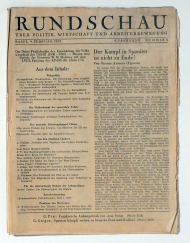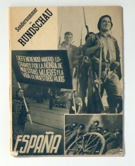 Sondernummer. Basel: Delta, 1939. S. [737]-816, zweispaltig, Dünndruck, mit illustriertem Umschlag und 4 einseitig bedruckten Tafeln mit Porträts von spanischern Vetretern von Politik, Militär und der KP, darunter ein ganzseitiges Porträt der Passionaria. Einband: Original-Broschur. Format: 4°. Reihe: Rundschau, 8. Jahrgang, Nr. 8, Februar 1939.