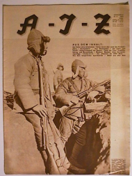 Mit einer zweiseitigen Reportage: "Kriegsmanöver überall". Bln.: Neuer Deutscher Verlag, 1927. 16 S., mit zahlreichen Abbildungen nach Fotografien. Einband: Illustrierter Original-Umschlag. Format: 30 x 44 cm. Reihe: A-I-Z (Arbeiter-Illustrierte-Zeitung).