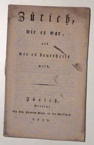 Zch.: verlegt bey Johann Heinrich Waser an der Marktgaß, 1799. 16 S., Einband: Original broschiert. Format: 8°. Erstausgabe. Barth 4441. Bestandesaufnahme über die Ursachen und Folgen der Besetzung der Schweiz - und namentlich Zürichs - durch Frankreich. MIt einer detaillierten Aufzählung der Rechte und Freiheiten sowie der Lehen und Gerichtsbarkeiten, die Zürich ab dem 12, Jahrhundert erlangte. Der Autor ist nicht bekannt, die Schrift wurde drei Jahre später (1802) nochmals unverändert nachgedruckt. Selten