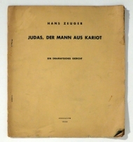 Ein dramatisches Gedicht. Jerusalem: Selbsatverlag, 1944. 19 S., Einband: Original-Broschur, klammergeheftet. Format: gr.8°. Erstausgabe. Nummeriert, Exemplar 82 von 100. Maschinengeschrieben, vervielfältigt. Im Impressum ist vermerkt "Als Kriegsausgabe in hundert vom Autor nummerierten Exemplaren vervielfältigt.Entstanden: August-September 1940", auf der Titelseite heisst es Shewuoth - Pringsten 1944. Judas Ischariot am Grab Jesu im Dialog mit Maria, den Jüngern, den leiblichen Brüdern Jesu und mit Joseph von Arimathea. Sehr selten. In den Bibliotheken sind ein weiteres Exemplar dieser nummerierten Ausgabe verzeichnet sowie drei einer zweiten Auflage aus dem gleichen Jahr.