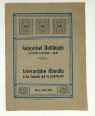 Abonnements-Einladung. Zch.: Lesezirkel Hottingen, literarische Gesellschaft, 1904. (12) S., Einband: Original-Broschur. Format: 4°. Erstausgabe. Bleuler-Waser (Lesezirkel Hottingen) S. 188. Das Programm für die Abende 35 (Detlev von Liliencron), 36 (Ernst Zahn), 37 (Hugo Wolf) und 37 (Gerhard Hauptmann). Von jedem der Künstler ein blattgrosses Foto-Porträt mit einer Legende mit Details zu den Veranstaltungen, gedruckt in Fraktur