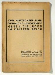 Dargestellt von der ökonomischen Abteilung des jüdischen Weltkongresses Paris, Genève, New York 1937. Paris, Genève, New York: Comité Exécutif du Congrès Juif Mondial, 1937. 87 S., Einband: Original-Broschur. Format: 8°. Erstausgabe. Deutsches Exilarchiv 5658. Dokumentation zur systematischen Vernichtung des Judentums in Deutschland, mit zahlreichen Tabellen, Textauszügen sowie einem ausführlichen Quellenverzeichnis. Anonym erschienen, Autor war Adolf Steinschneider. Selten