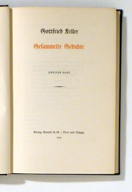 Zweiter Band. Bern; Lpz.: Benteli, 1937. 318, [1] S., mit einer Titelvignette nach der Keller-Medaille von Arnold Böcklin in Holzschnitt sowie einer gefalteten Tafel mit einer Seite aus dem Manuskriptband der "Gesammelten Gedichte". Einband: Blauer Or.Ln. mit Rückenvergoldung. Format: 8°. Reihe: Sämtliche Werke, auf Grund des Nachlasses herausgegeben von Jonas Fränkel. Zweiter Band, 1. Abteilung.
