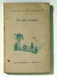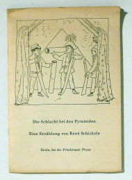Eine Erzählung von René Schickele. Berlin: Friedenauer Presse, 1969. 13, [1] S., nicht aufgeschnitten, Umschlagzeichnung von Lilo Fromm. Einband: Original-Broschur, klammergeheftet. Format: 8°. Erste Einzelausgabe in Auflage von 400 Exemplaren. Beigelegt ein dreifach gefalteter Prospekt der Friedenauer Presse