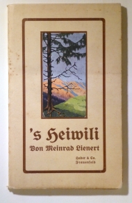 Ein Heimwehlied. Frauenfeld: Huber, 1908. 76, [8] S., Einband: Or.kt. mit Schutzumschlag. Format: kl.8°. Erstausgabe. Wilpert/Gühring2, 15. Wohl die meistgesuchte Publikation von Meinrad Lienert. Original-Kartonband mit einem gefalteten Umschlag, auf dem Deckel montiert eine hochformatige Abbildung einer farbigen Berglandschaft, gedruckt in Fraktur
