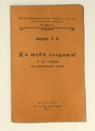 И другие очерки для солдатских чтений [Zu dir, Soldat! Und andere Skizzen für die Lektüre der Soldaten]. Иркутск: Тип. шт. Ирк. военного округа, 1917. 33 S., Einband: Original broschiert. Format: kl.8°. Reihe: Культурно-просветительная Лига Советов С.К. кр. деп. Восточной Сибири.