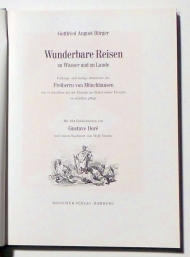 Feldzüge und lustige Abenteuer des Freiherrn von Münchhausen wie er dieselben bei der Flasche im Zirkel seiner Freunde selbst zu erzählen pflegt. Mit 154 Holzschnitten von Gustave Doré und einem Nachwort von Wolf Stubbe. Hamburg: Broschek, 1967. 189, [3]., Einband: Original-Leinwand mit transparentem Schutzumschlag. Format: 4°. Nummeriertes Exemplar, Nr. 561 von 1000 Exemplaren