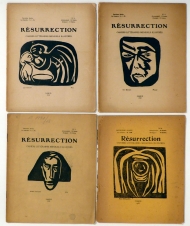 Cahiers littéraires mensuels illustrés. (Rédaction Clément Pansaers). Namur: s. n., 1917; 1918. 4 Hefte; S. 41-80, 121-159. 160-200, 201-238,, mit Illustrationen nach Holzschnitten von Albéric Thévenet, Rudolf Bauer, Guy Boscart und anderen. Einband: Or.br. Format: 8°. Reihe: Résurrections, 2. Jahrgang 1918, Nr. 2, 4, 5, 6.