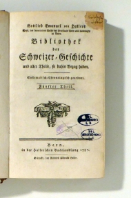 Fünfter Theil. Bern: Hallersche Buchhandlung, 1787. 618 S., Einband: Halbleder d.Zt. Format: 8°. Barth 9364. - Longchamp 1383. Neunter Abschnitt dieserer kritischen Betrachtung der Literatur zur Schweizer Geschichte. Vom Mittellalter bis zum Jahr 1725 ("Udligenschweiler-Handel" sowie Beschreibung des "Passionei-Handels" durch Franz Joseph Meyer. Mit ausfühhrlichem Register zu diesem Band. Halblederband der Zeit mit goldgeprägtem Titel auf dem Rücken und Lederecken