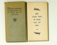 Paris: GLM, 1956, Novembre. 16 Bltt., Einband: ungebunden, in Klappenmappe. Format: kl.8°. Erstausgabe. Coron 416.- Exemplaire 7 imprimé pour Léo Kok, des 225 exemplaires numérotés (1-225) sur carte forte, tous hors commerce. Extraits choisis par Guy Lévuis Mano dans la Sainte Bible des Docteurs Louvain, composés et imprimés par lui "pour son plaisir et à l'intention de ses amis et compagnons de travail". Léo Kok gehörte zu den engsten Freunden von Guy Lévis Mano. Léo Kok (1893-1992), holländischer Komponist und Pianist, hatte vor dem Krieg in Paris gelebt und hatte dort Guy Lévis Mano kennen gelernt. Am 27. November 1943 wurde Kok verhaftet und nach Buchenwald deportiert; auch Guy Lévis Mano wurde verhaftet, er kam in ein Straflager nach Deutschland. Beide überlebten; während Lévis-Mano zurück nach Paris ging, zog Léo Kok nach Ascona wo er lange Jahre das legendäre Antiquariat "Libreria della Rondine" führte. Extrem rar