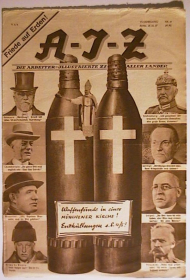 Titelblatt mit Abbildung zur zweiseitigen Reportage: "Die streitbare Kirche. Enthüllungen über Waffenlager in einer Münchener Kirche". Bln.: Neuer Deutscher Verlag, 1927. 16 S., mit zahlreichen Abbildungen nach Fotografien. Einband: Illustrierter Original-Umschlag. Format: 30 x 44 cm. Reihe: A-I-Z (Arbeiter-Illustrierte-Zeitung).