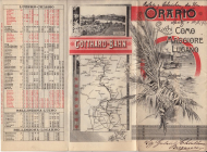 Lugano / Bergamo: Chiattone, 1897. 1 Bl., mehrfachgefalteter Plan mit 2 Titelillustrationen, einer Karten-Skizze und Anzeigen, verso mit lithographierter Karte und 6 lithographierten Illustrationen. Format: 51.5 x 38 cm. Schöner lithographierter Bahn- und Schiffs-Fahrplan der Gotthardbahn sowie der drei erwähnten Seen, mit Ansichten der drei Seen, Vogelschaukarte und drei Detailansichten. Mit eigenhändiger Widmung des Druckers Gabriele Chiattone