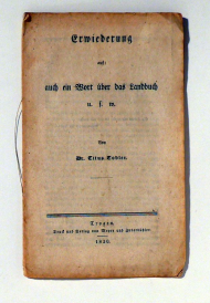 Trogen: Meyer und Zuberbühler, 1830. 15 S., Einband: Original broschiert. Format: gr.8°. Erstausgabe. Nicht bei Barth. Antwort an die Kritiker seiner im gleichen Jahr erschienenen Schrift " Der Rath am Falkenhorst oder: Bemerkungen über das Landbuch, das erneuerte Landmandat, die Sammlung der in Kraft bestehenden Verordnungen und andere Dinge, welche den getreuen, lieben Landleuten von Appenzell-Ausserrhoden zur Prüfung und Beherzigung vorgelegt werden". Angesprochen wird namentlich Jakob Nagel, damals Landeshauptmann, der sich mit "Auch ein Wort über das Landbuch" in der Auseinandersetzung um eine Erneuerung des "Landbuchs", der Gesetzessammlung des Appenzells, gegen Tobler gewandt hatte