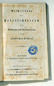 Zum Besten der Einwohner der abgebrannten Stadt Hof. Augsburg: Martin Engelbrecht, [1823]. 1 Bl., 96 S., mit 20 Kupferstich-Abbildungen auf 14 Tafeln. Einband: Halbleder der Zeit. Format: 8°. Erstausgabe. Mit einem chronologischen und nummerierten Verzeichnis der Päpste von Petrus (N° 1) bis Leo XII (N° 254), jeweils mit knappster Chrakterisierung und Wahljahr. Die Stiche illustrieren detailreich - Wahlzettel, Zimmerwerk für die Zelle, in der die Kardinale wohnen, Scrutinium, Ablieferung der Speisen, Prüfung der Speisen, etc. - die Eigenheiten der Konklave. Das Buch erschien 1923 gerade rechtzeitig zur Wahl von Leo XII, die Überschüsse gingen an die Opfer des Feuers, das im gleichen Jahr grosse Teile der Neustadt von Hof vernichtete. Das Buch erschien mit identischem Text aber in unterschiedlicher Ausstattung in zahlreichen weiteren Auflagen und bei verschiedenen Verlagen sowie in verschiedenen Sprachen. Die Liste der Päpste blieb aber unverändert, was vermuten lässt, dass diese Ausgabe die erste ist