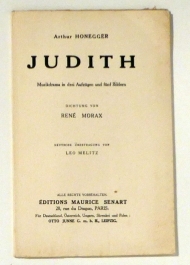 Musikdrama in drei Aufzügen und fünf Bildern. Dichtung von René Morax, deutsche Übertragung von Leo Melitz. Paris: Maurice Senart, 1926. 28 S., Einband: Or.br. Format: kl.8°. Erstausgabe. Erstausgabe des deutschen Textes für die Opernfassung. Honegger hat das ursprünglich "drame biblique" genannte Werk noch im Jahr der Erstaufführung in diese "Opéra sérieux" umgearbeitet