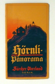 Aufgenommen im Herbst 1895 von Albert Bosshard. Im Auftrag der Direktion der Erziehung und der Volkswirtschaft des Kantons Zürich photolithographisch übertragen und nach neuen Naturaufnahmen ergänzt. Zch.: Hofer, 1931. 140 x 23,5cm (bxh); gefaltet 14 x 23.5 cm, Doppelpanorama: "Ansicht der Alpen und ihrer Vorberge" und "Jura, Schwarzwald und Hügelland". Einband: mehrfarbig illustrierter Original kartoniert. Hauri (Hofer & Burger) 454 Titel auf dem Umschlagdeckel: Hörnli-Panorama Zürcher Oberland 1133 M. ü. M. Beiliegend Werbeprospekt des Berggasthauses Hörnli-Kulm