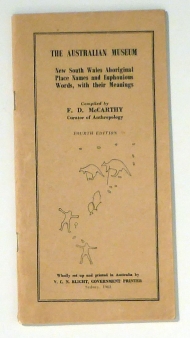 Compiled by Frederick D. McCarthy. Fourth Edition. Sydney: The Australian Museum, 1963. 32 S., Einband: Original-Broschur, klammergeheftet. Format: 8°, schmalhoch. Verzeichnis der Wohngebiete von Aborigines in New South Wales (NSW, Australien) und eine Deutung deren Namen in englischer Sprache. Dazu eine Karte von NSW in der die Siedlungsgebiete eingetragen sind