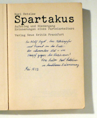 Aufstieg und Niedergang. Erinnerungen eines Parteiarbeiters. Ffm.: Neue Kritik, 1971. 500 S., Einband: Original-Broschur. Format: gr.8°. Erstausgabe. Gedruckt nach dem Typoscript. Mit einer eigenhändigen und datierten Widmung: *Adolf Vogel, dem Kämpfer und Freund in der Zeit der schwersten Not - im Kampf gegen den Nazismus! Vom Autor Karl Retzlaw in dankbarer Erinnerung. Mai 1972"