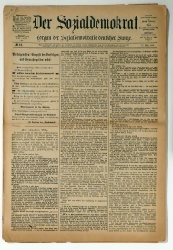 Konvolut von Ausgaben der Wochenzeitung „Der Sozialdemokrat“ aus dem Jahr 1988. Vorhanden sind die in der Schweiz hergestellten Ausgaben: N° 12, 15, 17, 18, 19, 21, 34, 37, 38, 39. "Der Sozialdemokrat" erschien während der "Sozialistengesetze" im Ausland. Zunächst, ab September 1879 in Zürich, dann, nachdem die schweizerische Regierung dem Druck Berlins nachgegeben hatte, ab 1. Oktober 1888 bis 1890 in London. Aus der Schweiz wurde die Zeitungen illegal über die Grenze gebracht und mittels der „Roten Feldpost“ verbreitet., gedruckt in Fraktur