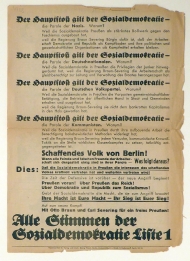 Alle Stimmen der Sozialdemokratie Liste 1. Bln.: Georg Wendt, 1932. 1 Bl., mit einer mehrfarbigen Bildgeschichte auf der Rückseite. Einband: Einblatt. Format: 2°. Doppelseitig bedruckte Flugblatt für die Wahl vom 24. April 1932 des Preussischen Landtags. Auf der Rückseite eine Bildgeschichte "Politisches Kabarett in Bildern" die schliesst mit. "Und die Moral von der Geschicht', O Michel, glaub' dem Zauber nicht. Wähl Liste 1, hör' Du gut zu, Dann hast Du vor'm Faschismus Ruh", gedruckt in Fraktur