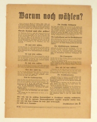 Wer will, daß die unfähige Parteiwirtschaft in Deutschland endgültig verschwindet, wer will, daß die nationale Wiederaufbauarbeit ungestört fortgesetzt werden kann, wer will, daß keine Stimme für diese Ziele verlorengeht, der wählt am 6. November Deu. Berlin: Verlag der Deutschnationalen Schriftenvertriebstelle, 1932. 1 Bl., Einband: Einblatt. Format: kl.8°. Erstausgabe. Wahlaufruf zur Reichstagswahl vom 6. November 1932. Gegenüber dem Wahlgang vom Juli des gleichen Jahres, verzeichnete die Partei wieder einen kleinen Gewinn., während die NSDAP Sitze verlor. Die DNVP, gegründet 1919, zu deren Gründer Alfred Hugenberg und Alfred von Tirpitz gehörten, war von Angfang an antisemitisch und schloss sie bei den Januarwahlen von 1933 der NSDAP an. In der immer undurchsichtiger werdenden Parteienlandschaft versuchte sich die DNVP hier gegenüber den anderen grösseren und kleineren Splitterparteien zu profilieren. Einseitig bedrucktes Flugblatt Nr. 644, gedruckt in Fraktur