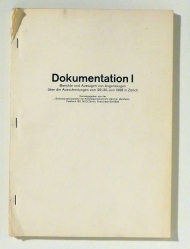 Berichte und Aussagen von Augenzeugen über die Ausschreitungen vom 29./30. Juni 1968 in Zürich. Herausgegeben von der Dokumentationsstelle Der Arbeitsgemeinschaft 'Zürcher Manifest'. Zch.: Zürcher Manifest, 1968. 95 Bll., Einband: ohne Einband, klammergeheftet. Format: 4°. Erstausgabe. Typoskript . Herausgeber war das "Zürcher Manifest", das gegründet wurde zur Abklärung der Ereignisse um den sogenannten Globus Krawall vom 29. und 30. Juni 1968, bei dem es zu schweren Zwischenfällen gekommen war. Zu den Erstunterzeichnern gehörten unter anderem Max Frisch, Gottfried Honegger-Lavater, Walter M. Diggelmann, Marcel Beck, Peter Heintz, Arnold Niederer, Arthur Rich, Alfred Schindler, Paul Parin, Franz Schumacher, Peter Keckeis, Paul Nizon, Alice Vollenweider und zahlreiche weitere Persönlichkeiten aus dem Umfeld von Universität, Kunst und Politik. Absicht war der Aufbau einer «umfassenden Dokumentation», «die den Anwälten von Geschädigten oder Angeschuldigten zur Verfügung steht und die wissenschaftlich ausgewertet werden soll» (aus dem Zeugenaufruf). Beigelegt sind, neben dem Zeugenaufruf, 5 Flugblätter aus den ersten Wochen nach dem «Krawall» sowie ein vierseitiges «Informations-Extrablatt» im Format DIN A2 mit Fotoabbildungen und Karikaturen