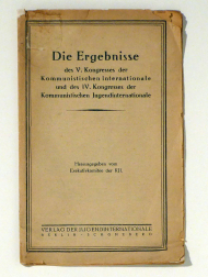 Herausgegeben vom Exekutivkomitee der KJI. Berlin Schöneberg: Verlag der Jugendinternationale, [1924]. 23, [1] S., Einband: Original-Broschur. Format: 8°. Erstausgabe. Der Kongress fand vom 17. Juni bis zum 8. Juli in Moskau statt. Er brachte den Entscheid im Machtkampf um die Nachfolge Lenins, der am 24. Januar des gleichen Jahres gestorben war und brachte die Bolschewisierung der kommunistischen Parteien, was den Sieg Stalins und dessen Position vom Aufbau des Sozialismus in einem Land bedeutete. Sehr selten