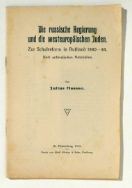 Zur Schulreform in Rußland 1840-44. Nach archivalischen Materialien. St. Petersburg: Alkalay in Preßburg, 1913. 35 S., Einband: Original-Broschur. Format: 8°. Separatdruck aus: Monatsschrift für Geschichte und Wissenschaft des Judentums ; Jg. 57
