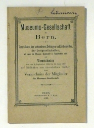 Verzeichniss der vorhandenen Zeitungen und Zeitschriften, der Lesegesellschaften, mit denen die Museums-Gesellschaft in Tauschverkehr steht, und Verzeichniss der vom 1. September 1890 bia 30 Juni 1892 der Bibliothek neu einverleibten Bücher sowie Ver. Bern: Wyss, 1892. 35 S., Einband: Original-Broschur. Format: kl.8°.