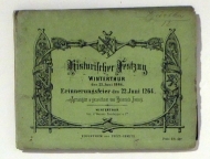 Erinnerungsfeier des 22. Juni 1264. Arrangirt & gezeichnet von Heinrich Jenny. Winterthur: Wurster Randegger, 1864. 1 Bl., 29fach gefaltet, lithographierte Umrisszeichnung. Einband: Original kartoniert, illustriert. Format: 447,5 x 11,5 cm; gefaltet 15,5 x 12, 5 cm. Barth 33110. 600 Jahr-Feier des Übergangs von Winterthur an die Habsburger und der Verleihung des Stadtrechts.. In dem Umzug wurden die wichtigsten Ereignisse der Winterthurer Geschichte dargestellt, von der Besitznahme durch Rudolf von Habsburg bis zum Verfassungsfest von 1798 in 15 Gruppen. Heinrich Jenny gehörte zu den prominenten Karikaturisten seiner Zeit, er war auch Herausgeber des "Postheiri"