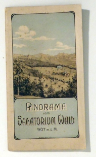 Gezeichnet von Robert Rieser, Zürich 1906. Zch.: Hofer & Co,, 1906. 1 Bl., mehrfach gefaltet, Einband: Or.kt.-Mappe. Format: 133 x 21 cm (bxh); gefaltet 12 x 21 cm. Erstausgabe. Hauri (Hofer & Burger) 492. Schwarze Lithographie. Das mehrfach gefaltete Panorama vom Sanatorium Wald ist eine Mappe mit einer Farblithographie von Wald auf dem Umschlag eingeklebt. Gipfel mit Namen und Höhenangabe, Ortschaften mit Namen