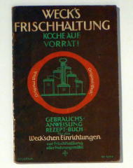 Koche auf Vorrat mit Original Weck. Einrichtungen zur Frischhaltung aller Nahrungsmittel. Crefeld: Druck Worms & Lüthgen, o.J.. 64 S., mit Kopfvignetten und s/w Illustrationen im Text. Einband: Original-Broschur. Format: 8°. Titel auf Vorderumschlag: "Weck's Frischhaltung. Koche auf Vorrat!" unten links mit dem Vermerk "Ges. Gesch." unten rechts "No. 1247"