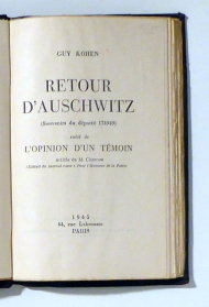 Suivi de L'opinion d'un témoin. Article / de M. [A.] Charrow (Extrait du journal russe "Pour l'honneur de la Patrtie" [du 13 février 1945]. Paris: Druck: Brodard et Taupin, 1945. 170, [3] p., Einband: Pappband mit Leinenrücken. Format: kl.8°. Erstausgabe. Anschliessend an den Bericht über seine Zeit in Auschwitz Briefe und weitere Dokumente aus den ersten Monaten nach der Rückkehr nach Frankreich sowie ein Artikel des sowjetischen Auschwitz-Häftlings A. Charrow aus einer russischen Zeitschrift