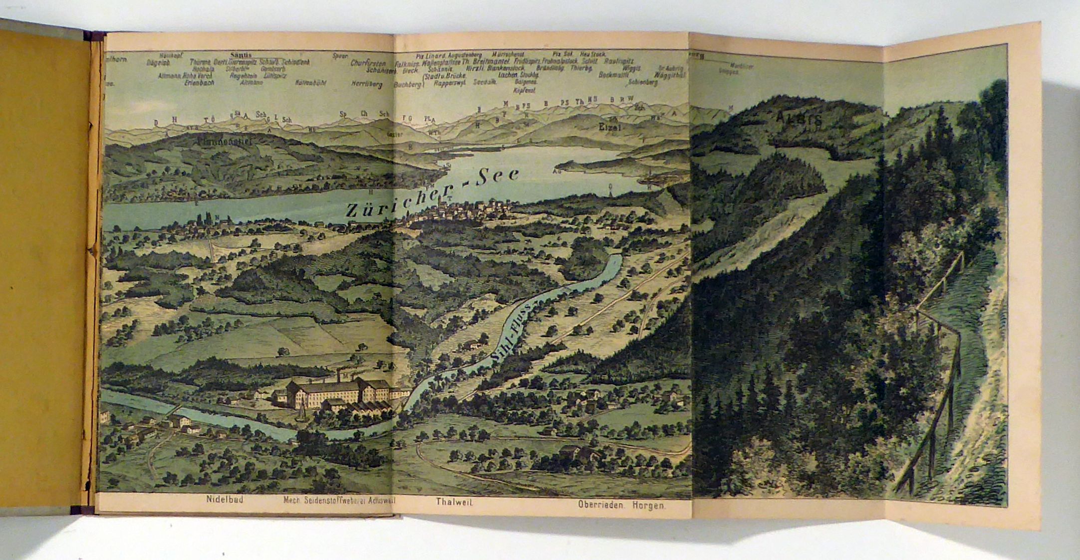 Prachtvoller Aussichtspunkt mit Sommerwirthschaft. Zwischen Üetliberg und Albishochwacht. Besitzer: J.J. Huber. Zch.: R, Fretz, um 1890. 140 x 19,7 cm gefaltet, farbig lithographiertes Faltpanorama. Einband: Or.Pbd. mit schmalem Leinwandrücken. Format: 8°. Erstausgabe. Aus dem Verlagsarchiv von Hofer & Burger, mit entsprechendem handschriftlichen Vermerk