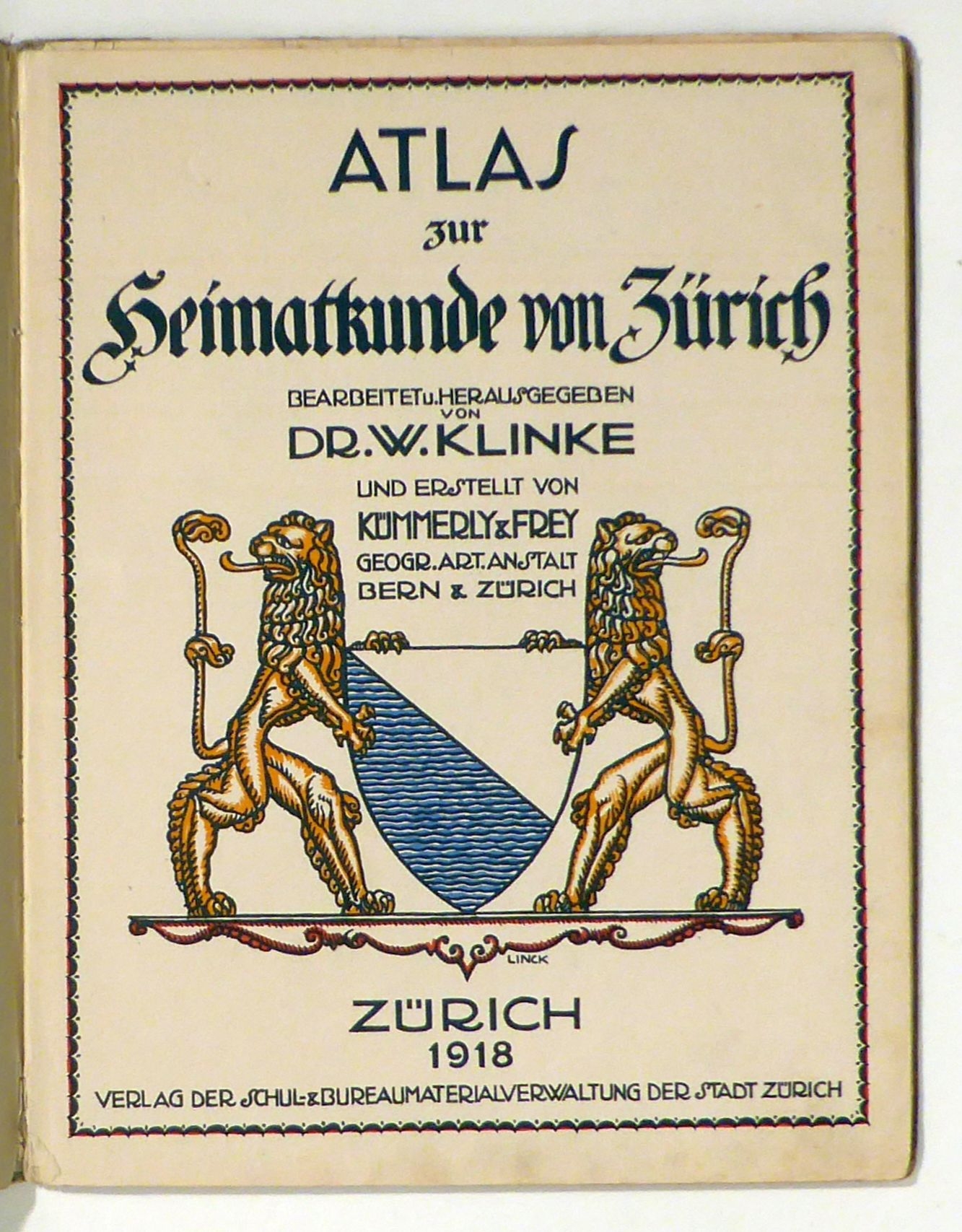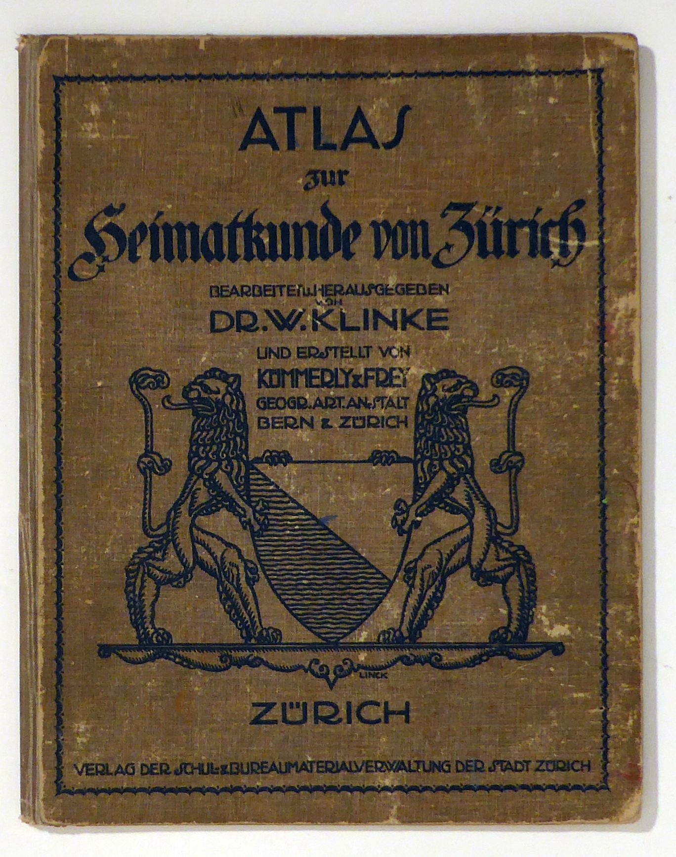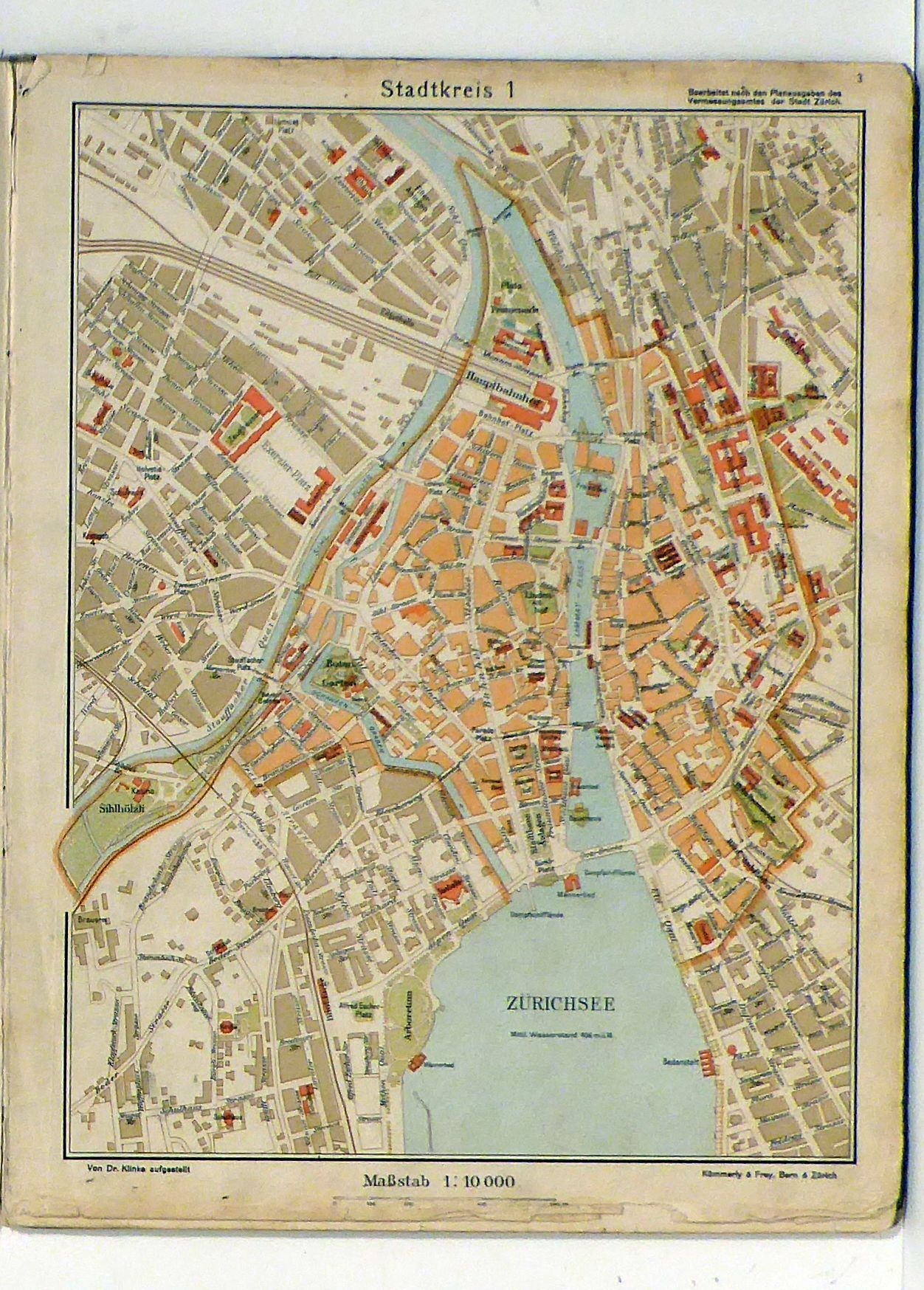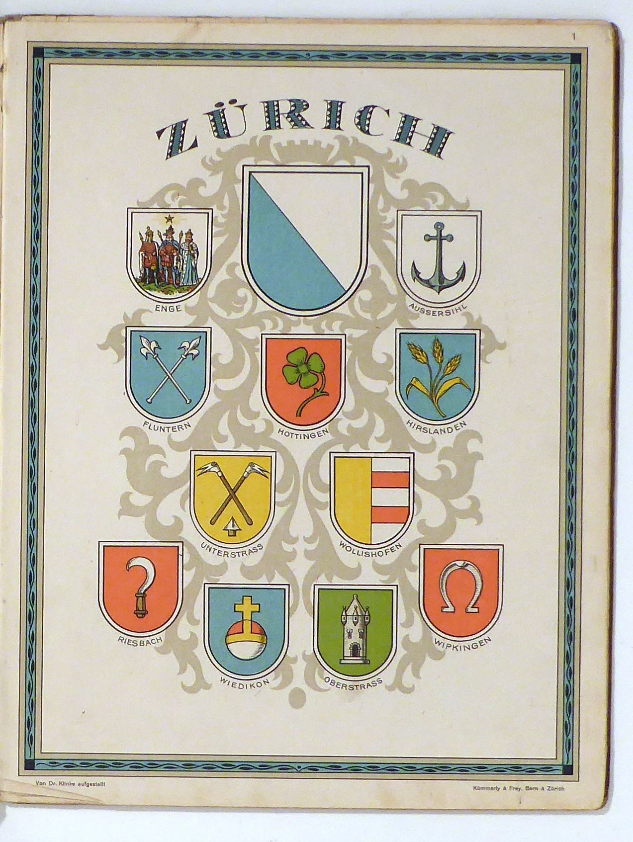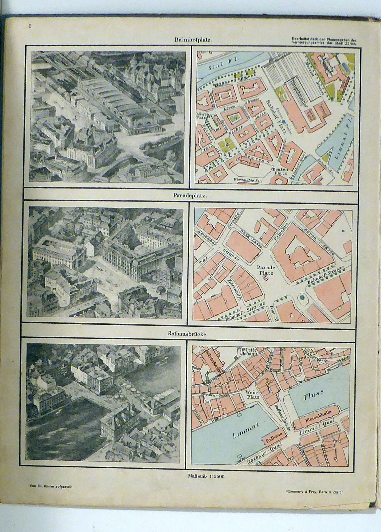 Bearbeitet und hrsg. von W(illibald) Klinke und erstellt von Kümmerly & Frey. Zch.: Verlag der Schul- u. Bureaumaterialverwaltung der Stadt, 1918. 19 S., mit mehrfarbigen Abbildungen und Plänen. Einband: Or.Hln. Format: 4°. Erstausgabe. Mit Quartierwappen, Detailplänen der Quartiere, einem doppelblattgrossen facsimilierten "Murer"-Plan, einer doppelblattgrossen farbigen Panorama-Karte und einer doppelblattgrossen Wiedergabe des H(ans) F(elix) Luethold-Plans von 1850 und einigen Ansichten
