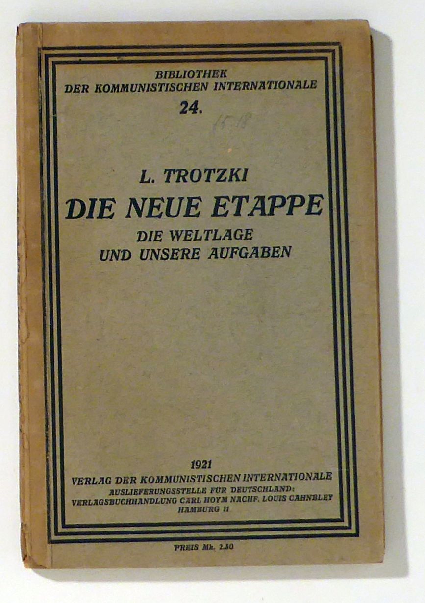 Die Weltlage und unsere Aufgaben. Hamburg: Verlag der Kommunistischen Internationale, 1921. 167 S., mit 3 farbigen Falttafeln. Einband: Original broschiert. Format: 8°. Reihe: Bibliothek der Kommunistischen Internationale, 24.