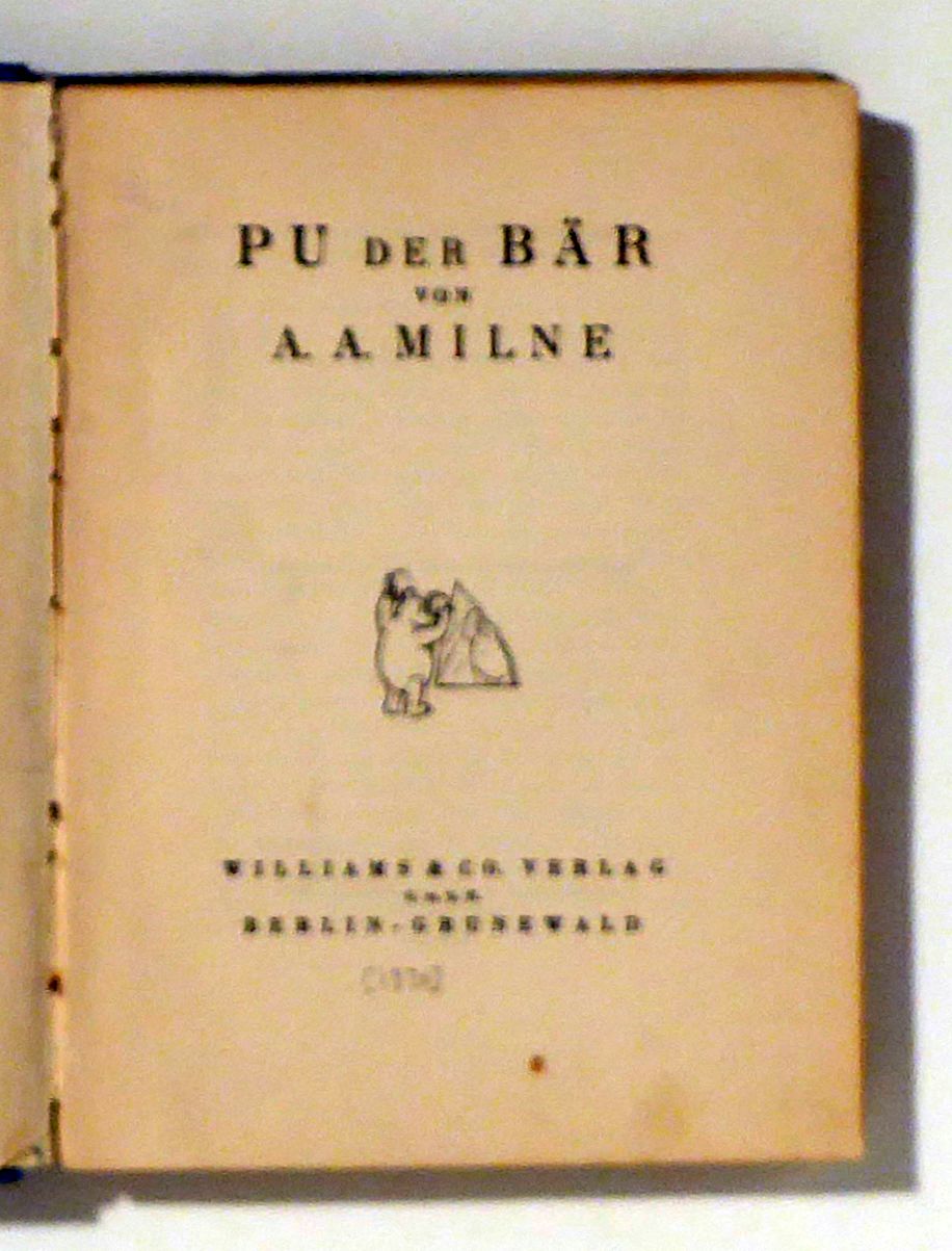 Eine Geschichte für Kinder. Übertragen und Neubearbeitung von E. L. Schiffer. 7.-12. Auflage. Bln: Williams, [1930]. 202, [5] S., mit s/w Illustrationen nach Zeichnungen von Ernest H. Shepard. Einband: Or.Hln. mit Deckelill. Format: 8°.