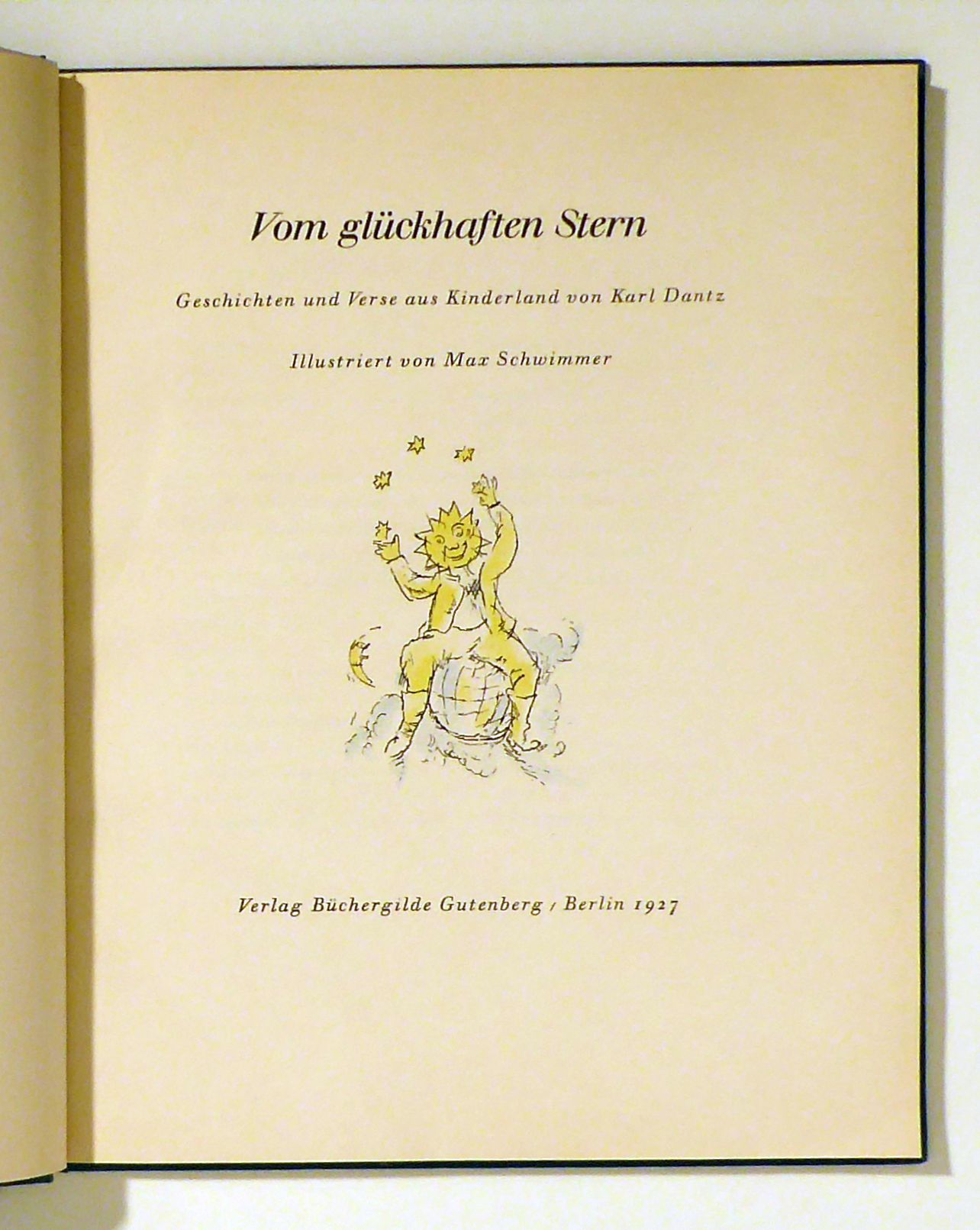 Geschichten und Verse aus Kinderland. Bln.: Büchergilde Gutenberg, 1927. 128 S, mit farbiger Titelvignette und zahlreichen farbigen Illustrationen nach Zeichnungen von Max Schwimmer. Einband: Blauer Or.Ln. mit gelber Typographie. Format: 4°. Erstausgabe. Der Titel auf Deckel und Rücken in Sütterlin