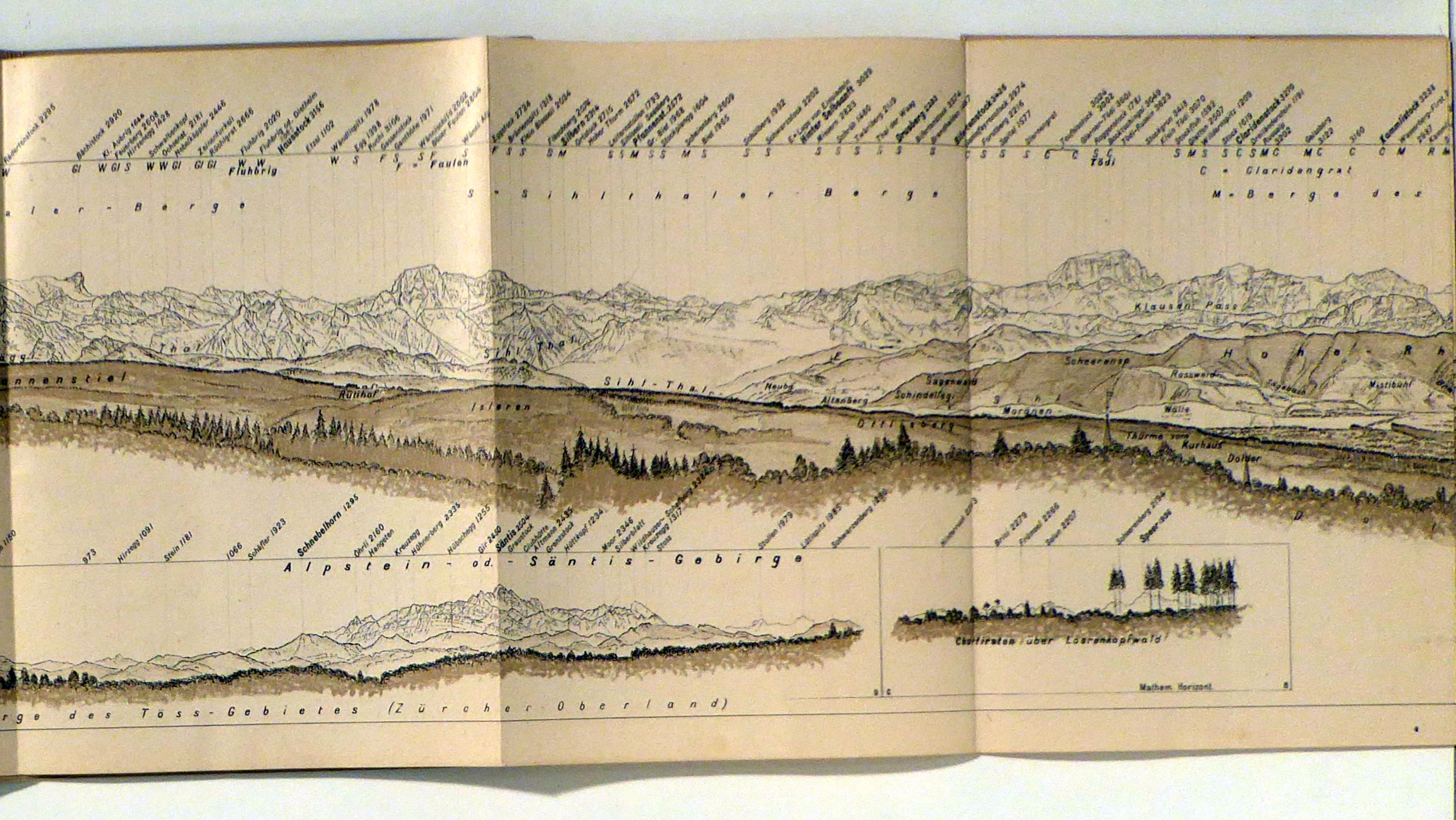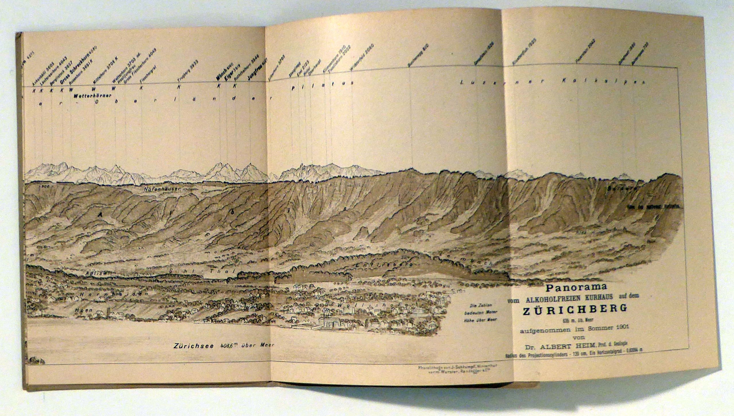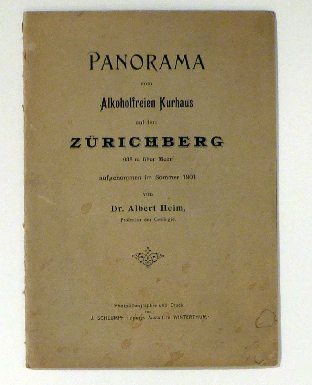Radius des Projectionscylinders = 120 cm, 1 Horizontalgrad = 0,02094 m. Winterthur: J. Schlumpf, vormals Wurster, Randegger, um 1905. 152 x 19,5 cm (bxh), gefaltet 14 x 20 cm, Photolithographie in Schwarz und Sepia. Einband: Original kartoniert. Format: 8°. Erstausgabe. Erste Ausgabe, noch mit J. Schlumpf als Verleger, ab 1906 wurde als Verlag Kartographia angegeben. Eingeklinkt zwei Abbildungen: Mittelgrund: Berge des Töss-Gebietes (Zürcher-Oberland); Churfirsten über Loorenkopfwald. Diese Ausgabe istäusserst selten.