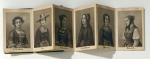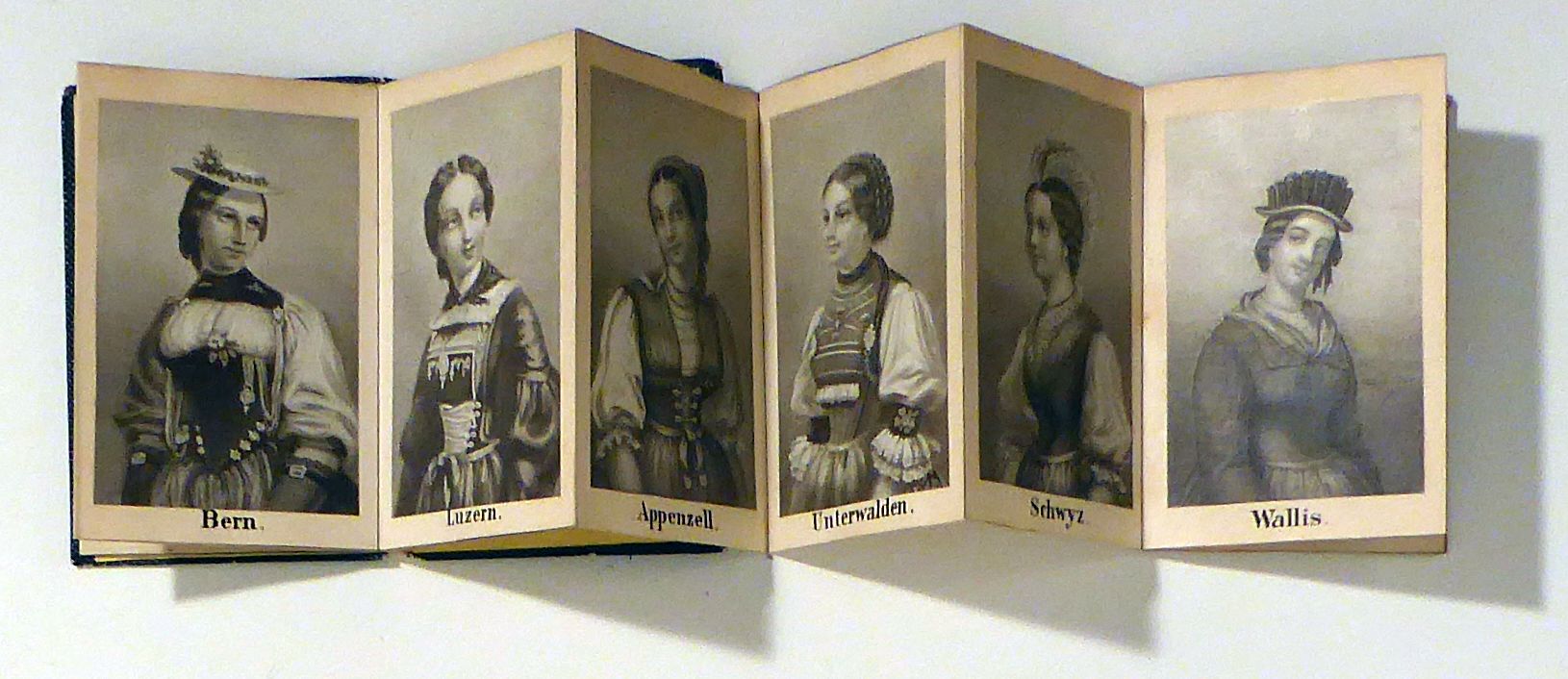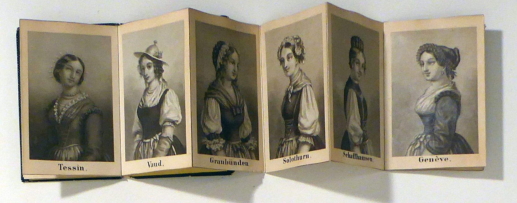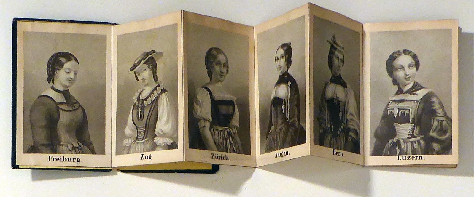 Zürich: J. H. Locher, o.J. ca, 1880. Leporello; Gesamtlänge 139 cm, Getönte Lithographie mit 23 Trachtendarstellungen (Frauentrachten, Porträts). Einband: Leinwand der Zeit in illustriertem Schuber. Format: 10 x 7 cm. Schlichter grüner Ln.-Einband d.Zt. in violettem Schuber mit farbig lithographiertem Deckelbild, dieses mit den 23 Kantonswappen und dem Schweizerwappen