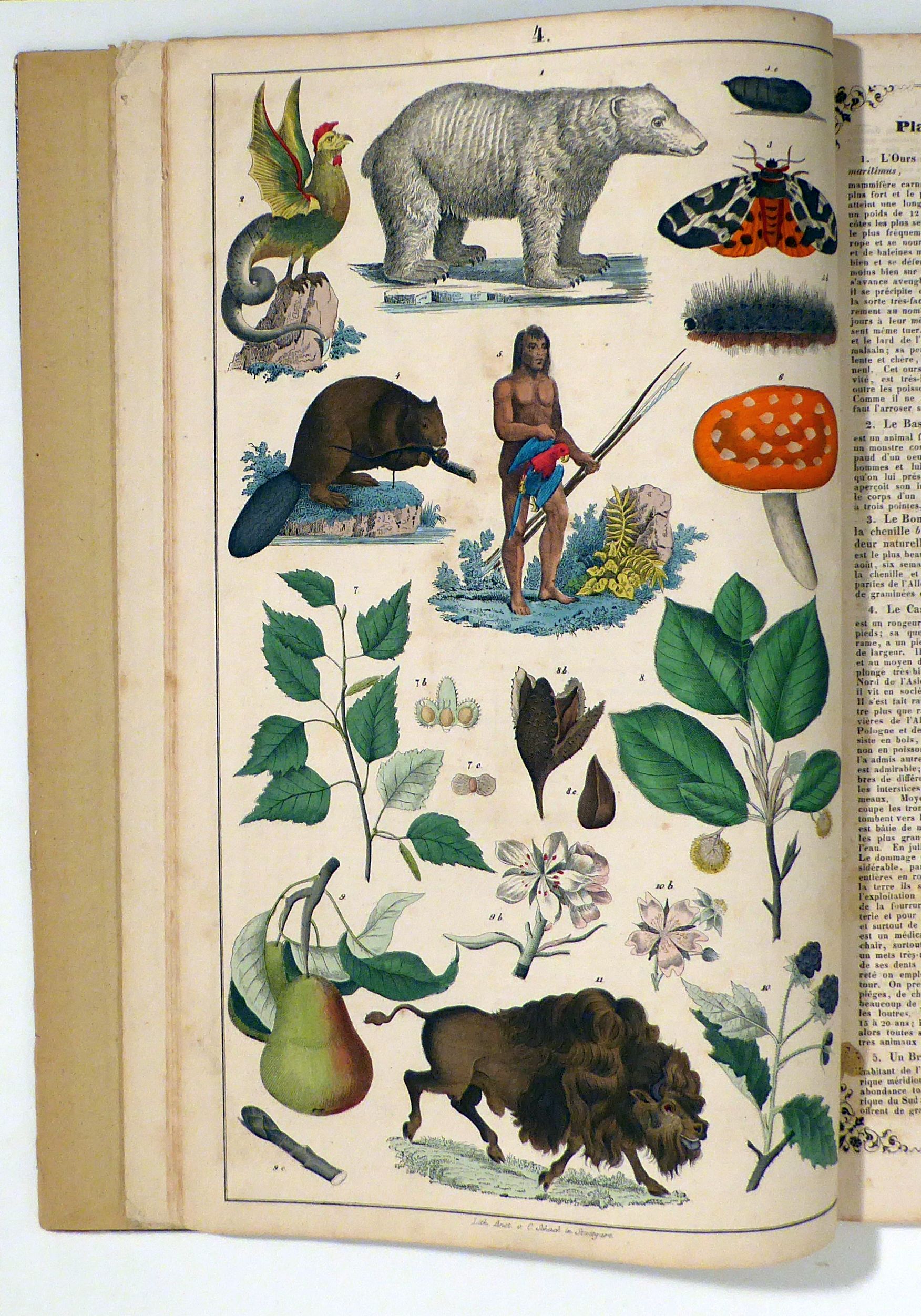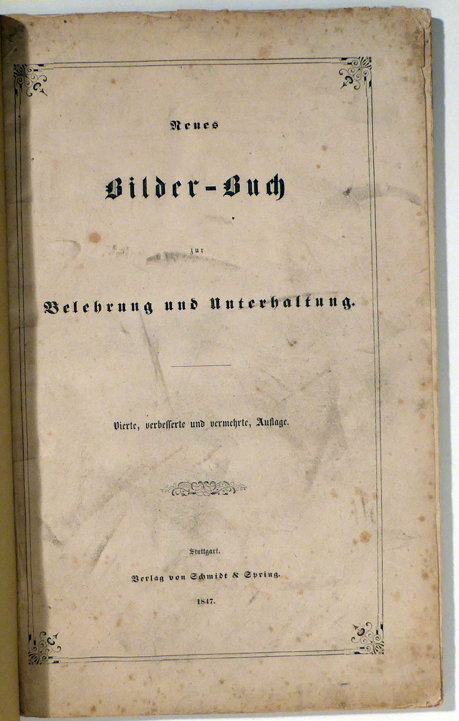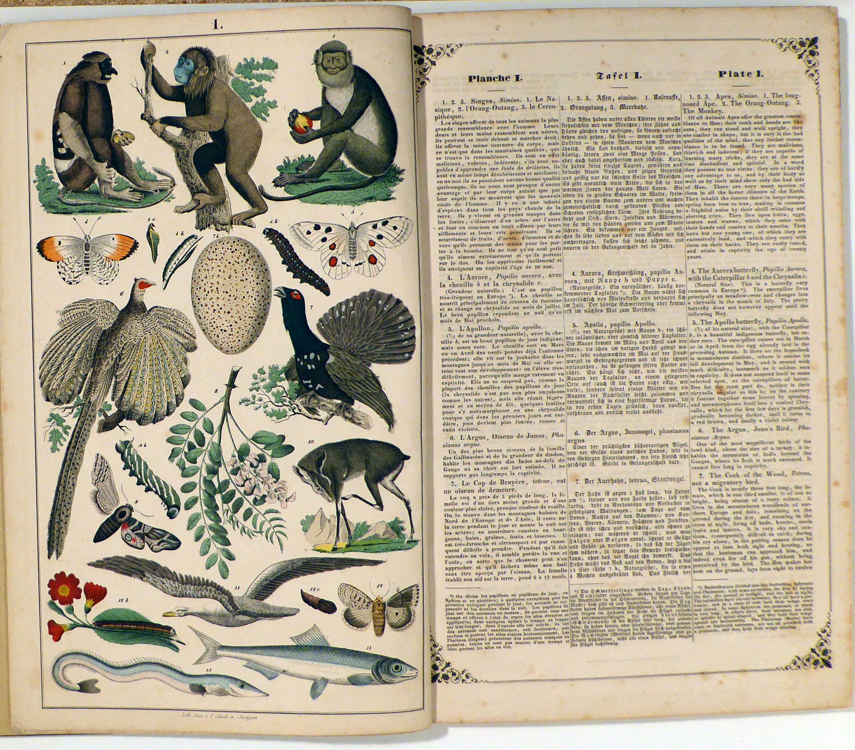 Vierte, verbesserte und vermehrte Auflage. Stgt.: Schmidt & Spring, 1847. (60) S., 29 lithographierte, handkolorierte Tafeln mit über 400 Darstellungen und einer lithographierten Karte. Einband: Halbleinwand. Format: 4°. Wegehaupt III, 4203 a (dritte Auflage). Die Tafeln wurden in der lithographischen Anstalt C. Schack in Stuttgart hergestellt. Der dreispaltig gedruckte Text dreisprachig (französisch, deutsch, englisch). Schön illustrierter, naturwissenschaftlicher Orbis Pictus, der Tiere und Pflanzen von 'Affe' bis 'Zuckerrohr' abbildet und beschreibt. Die Tafeln in leuchtendem Kolorit. Schwarzer Bibliotheks-Halbleinenband mit marmorierten Überzugspapieren und erneuerten Vorsatzpapieren